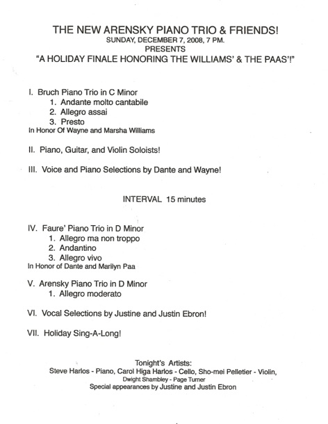 This Web-Page is Dedicated to ALL the Phenomenal Musicians that performed with the Arensky Piano Trio, throughout the Years, and especially to Wayne and Marsha Williams, Dante and Marilyn Paa, and ALL the Wonderful People who came and supported the Trio for all these years!!